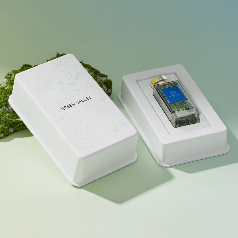 Sculptural molded pulp outers and snug bottle inserts. Elevate luxury scents with bespoke, plastic-free kitting that defines modern sustainable elegance.