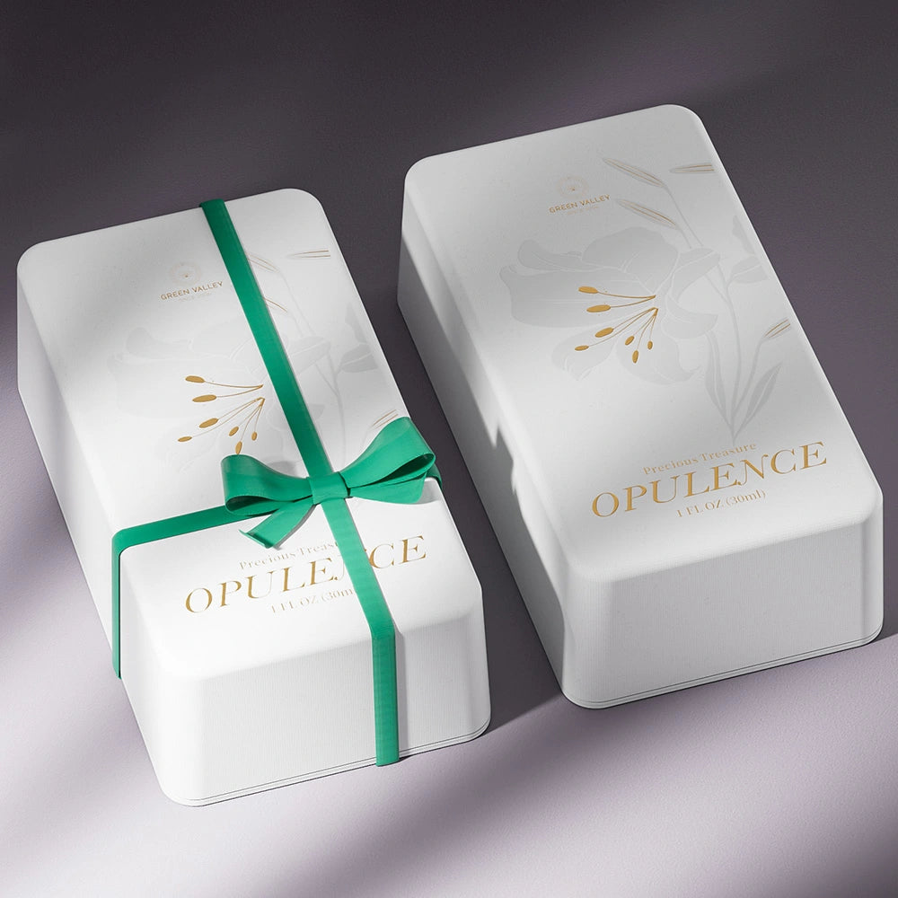 A hand-tied satin ribbon in deep forest green wraps the package horizontally, culminating in a sculptural bow that transforms functional closure into decorative focal point. The ribbon serves triple purposes: preventing accidental opening during transport, providing intuitive visual cues for unwrapping direction, and adding tactile softness that contrasts beautifully with the matte pulp texture. This gifting-ready presentation eliminates need for secondary wrapping at retail, reducing material waste while delivering premium unboxing experiences straight from shelf to recipient. The verdant hue creates chromatic harmony with "Green Valley" branding while evoking natural freshness—subconsciously linking fragrance notes to outdoor botanical gardens and dewy meadows before customers ever uncap the bottle.