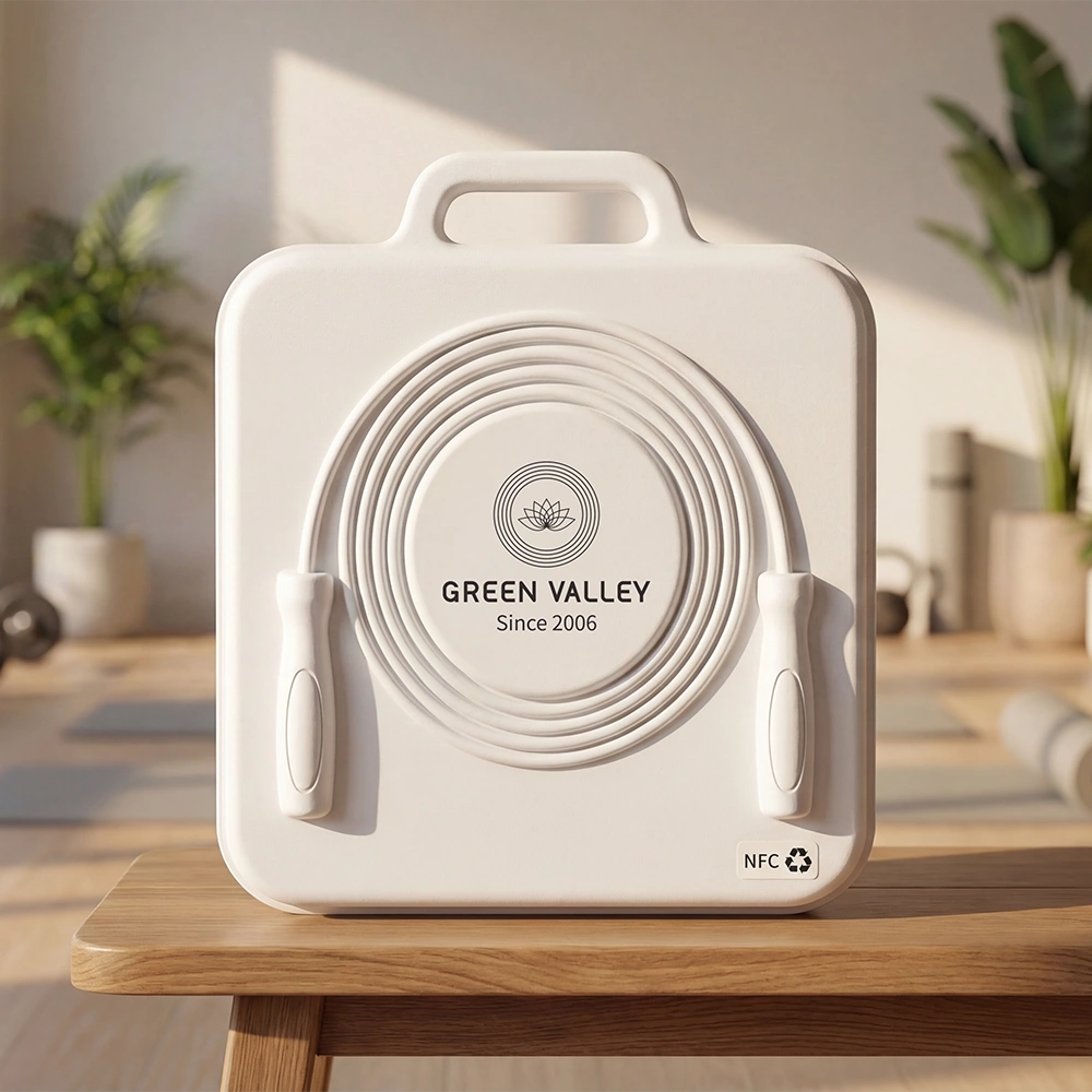 Formed from natural fiber pulp with a characteristic off-white speckled texture, this biodegradable jump rope packaging contains no plastic inserts, no foam padding, and no synthetic lining — the molded structure alone provides all necessary protection. The lid snaps onto the base without clips or adhesive, and the entire unit composts at end of life. For fitness and wellness brands replacing blister cards and plastic clamshells, this format delivers structured protection, peg-ready retail display, and a fully compostable disposal path in one piece.